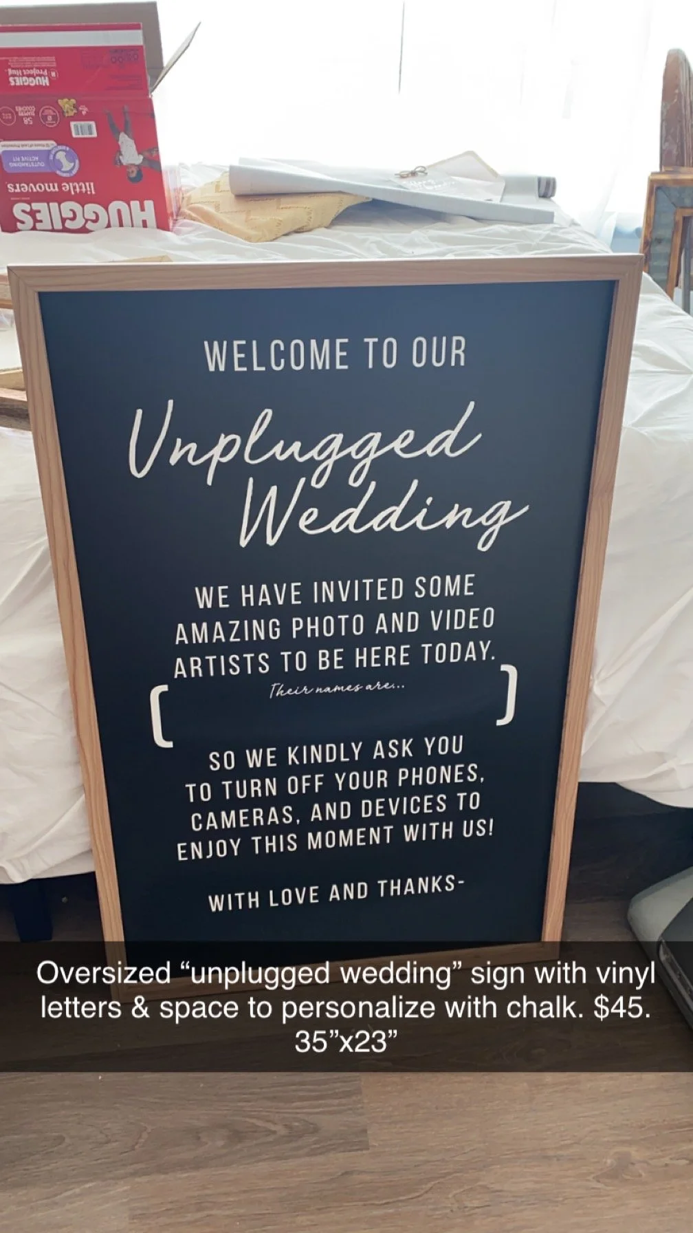 $45 - Oversized “UNPLUGGED” Ceremony Sign with Vinyl Letters & space to personalize with chalk. 35”x23”
