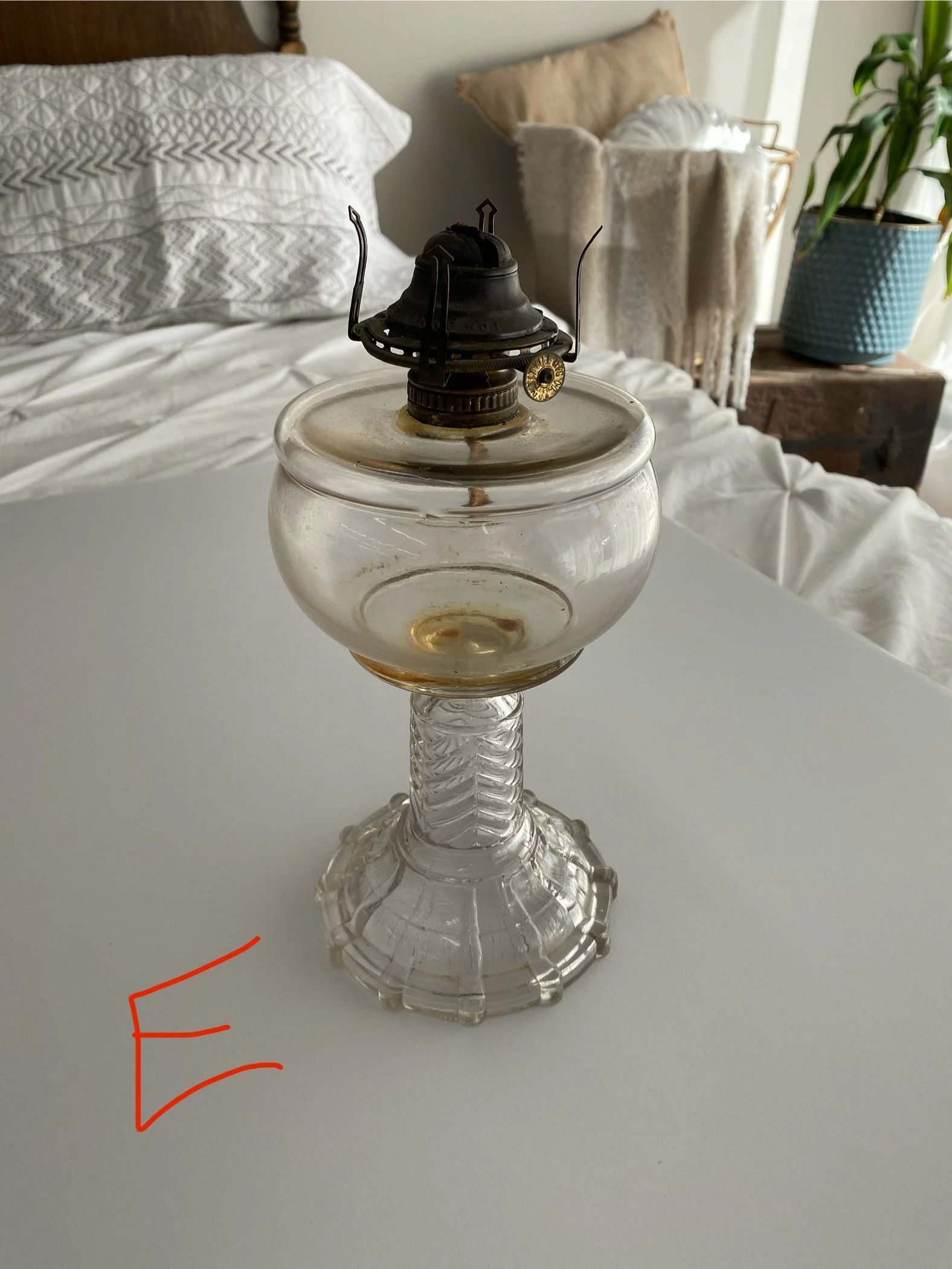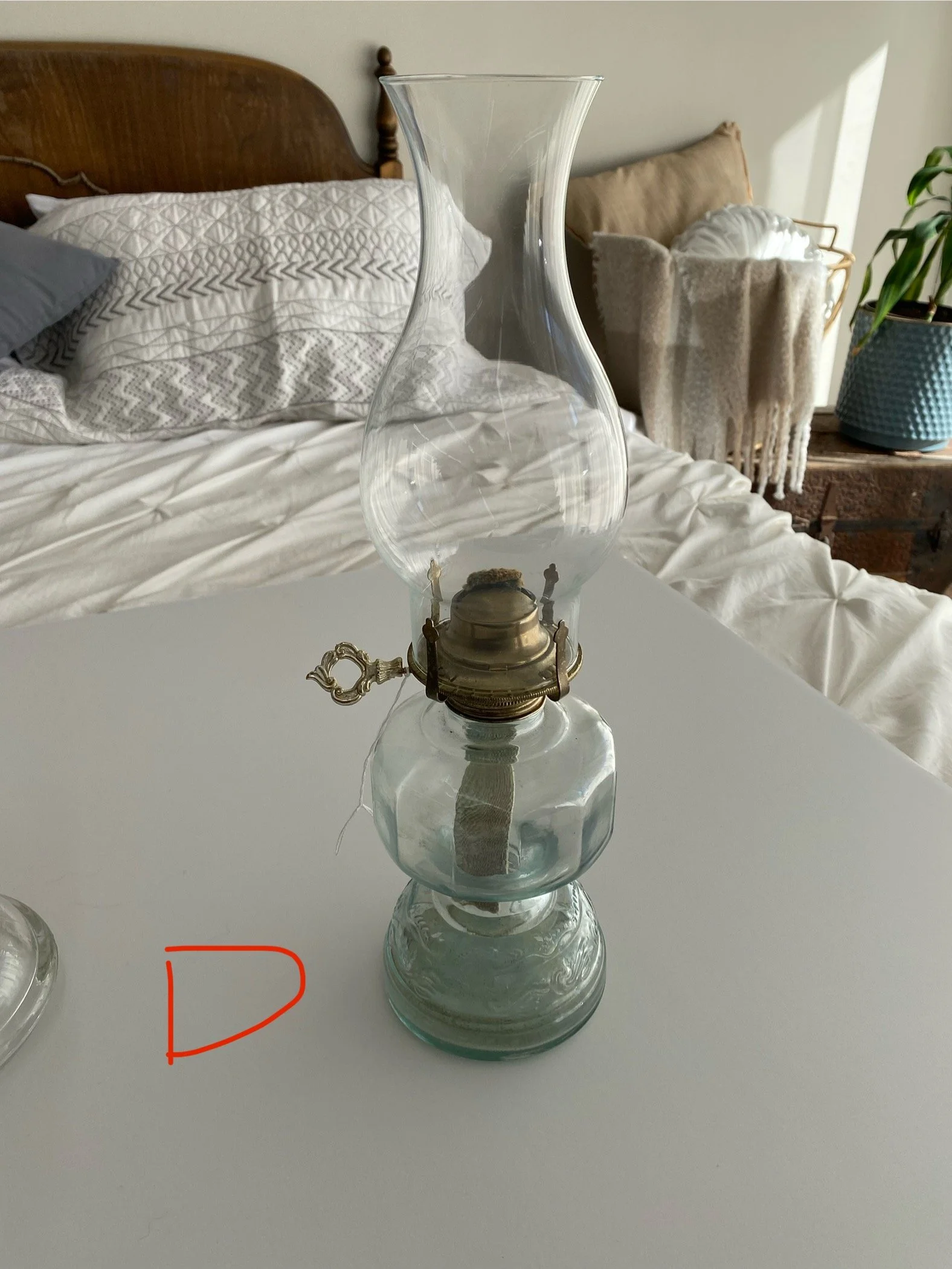 $20, $20 - Antique Lantern "D." Blue glass, top is loose. (Should be able to tighten it up.)