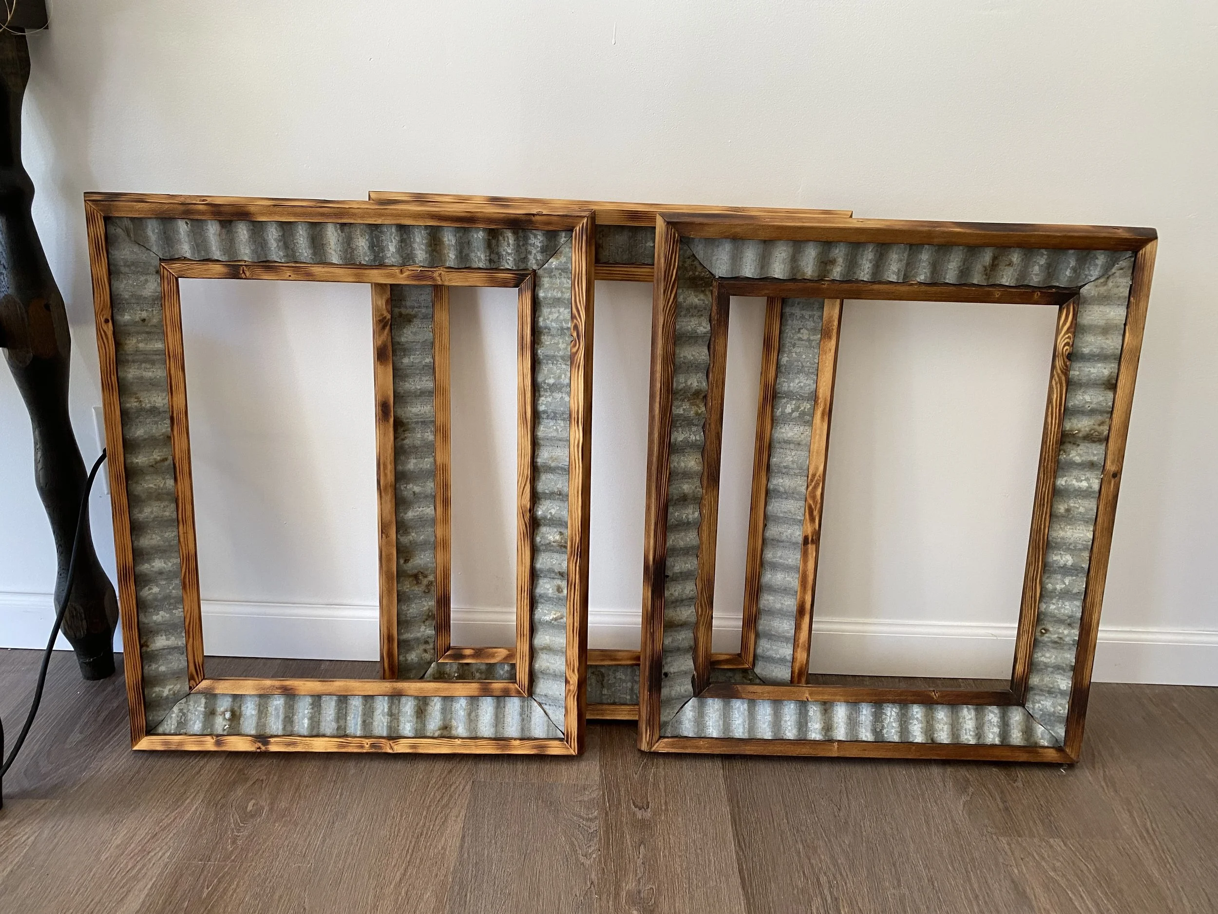 Hand crafted Open Back Frames. Tin & Burned wood. No glass or backing. Measurements below are the opening. Each is totally unique. 3 @ 16x20 ($25 ea)